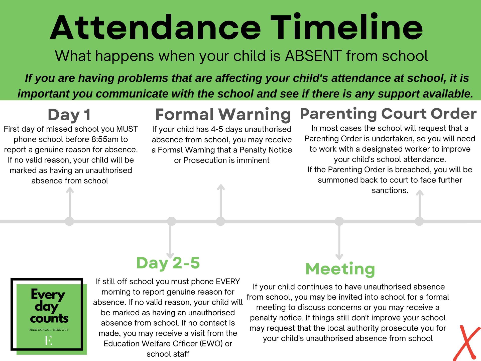 If your child is persistently absent and strategies we put in place with you do not improve your child's attendance, you may be required to attend a meeting with the EWO. If further improvements are not made, then a fine may be issued.