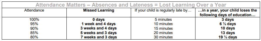 To comply with the legislation, we record all unauthorised absences and these are reported to parents on their child’s annual school report. Children who arrive later than 9:20am are recorded as an unauthorised absence.