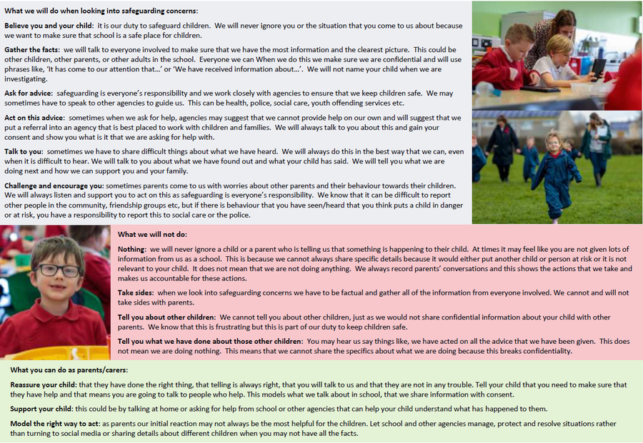 Part of our responsibility in this area is to work with outside agencies such as Social Care, Children's Centres, Health Services, the Police and Family Wellbeing Team to make sure all pupils are kept safe. This means that at times we are obliged to pass on concerns or information to these agencies. The school will always do this in consultation with parents except in circumstances where a child is at risk. To do this effectively, we have one person in the school who co-ordinates this work, this person is known as the Designated Safeguarding Lead.  They are supported by a safeguarding team and Safeguarding governor.