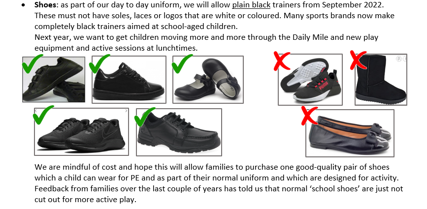 Footwear: All shoes and boots must be plain black. sandals, ballet pumps and ‘Ugg’ style boots are not permitted. All shoes should have good grip, be secured to the foot (laces, Velcro or buckled straps) and be suitable for active play e.g. children can run a mile in them.